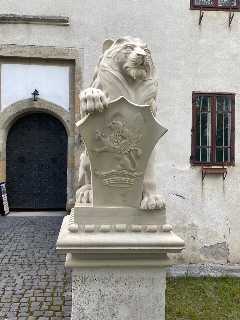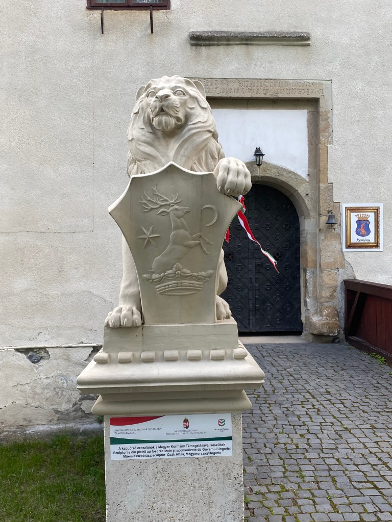 A kastély bejáratát örző kőoroszlánok reprodukciói. Az eredeti szobrokat a kastély fosztogatása során ellopták. A baloldali pajzson a Kemény címer, míg a jobboldalin Bánffy címer látható.
